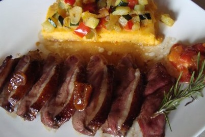 Au moment du service, chauffer fortement une poêle, éponger la viande avec du papier absorbant et la rissoler 2 min d’abord côté graisse puis côté chair.